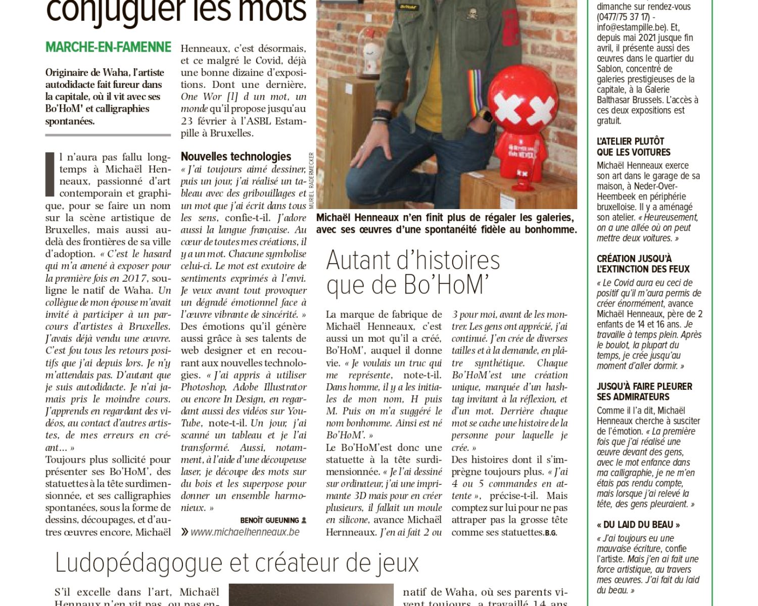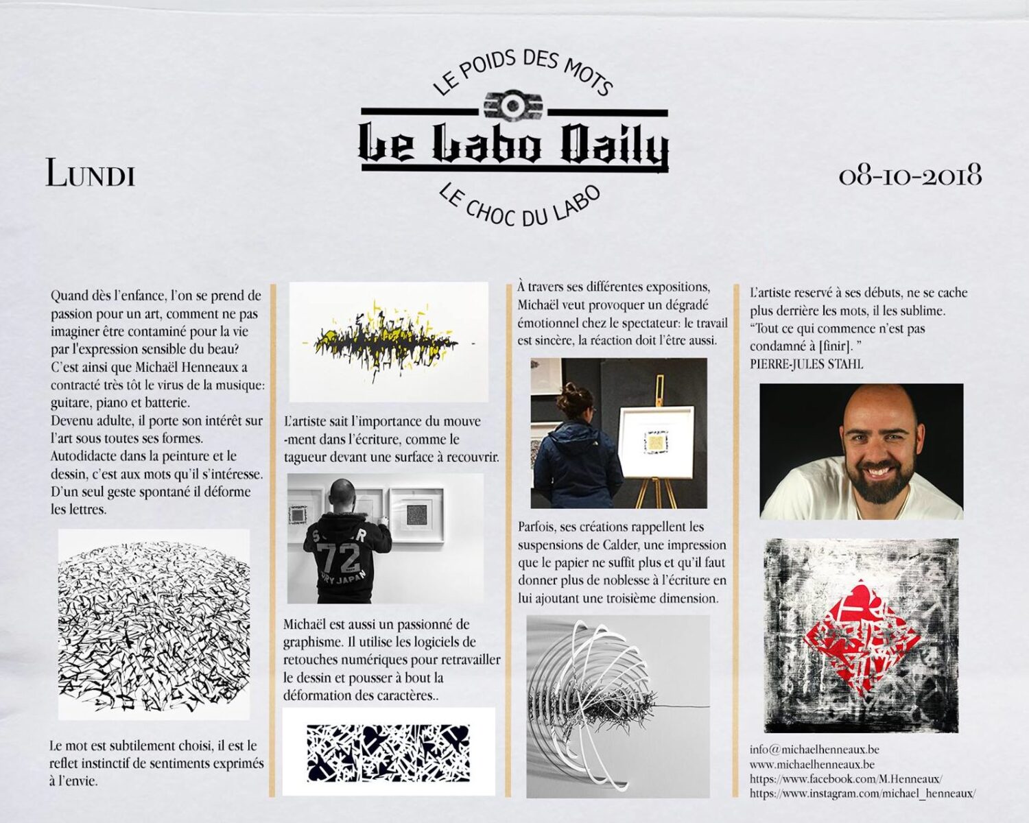 Michaël Henneaux, artiste bruxellois, est un passionné d’art contemporain, d’art graphique et de design web. Grâce à son imagination débordante, son opiniâtreté et son perfectionnisme, cet autodidacte est capable de faire émerger la puissance des mots dans ses œuvres, telles que les calligraphies spontanées, les découpages calligraphiques et les Bo’HoM’.